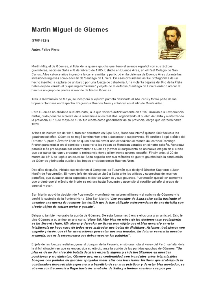 La historia de amor de güemes y carmen puch que hizo patria. Fue gobernador de salta por 6 años, y a pesar de que el estado no contaba con suficientes recursos fue capaz de librar la lucha contra las guerrillas, en las conocidas guerras gauchas, fue capaz. Martín miguel de güemes fue el único general argentino caído en acción de guerra exterior. Su padre fue tesorero real de la corona. Resumen de la vida de martín miguel de güemes.